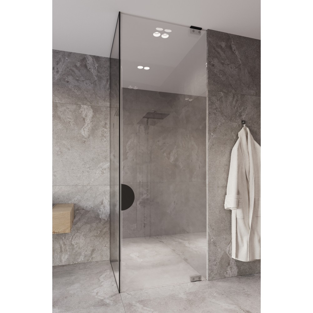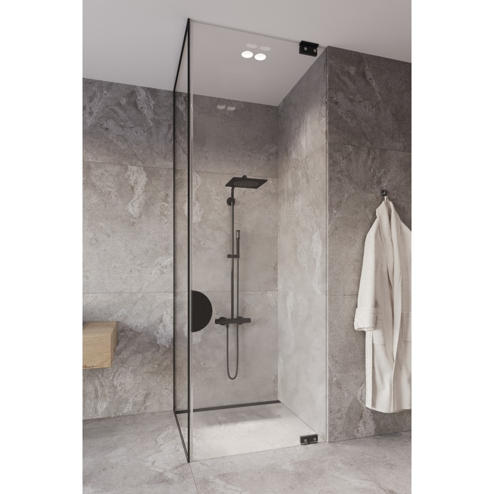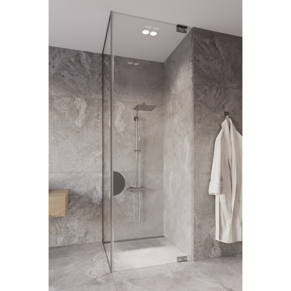 Minimalistische Duschkabine aus der PREMIUM-Kollektion mit zwei Wänden, authentischem Griff und Pivot-Scharnieren.