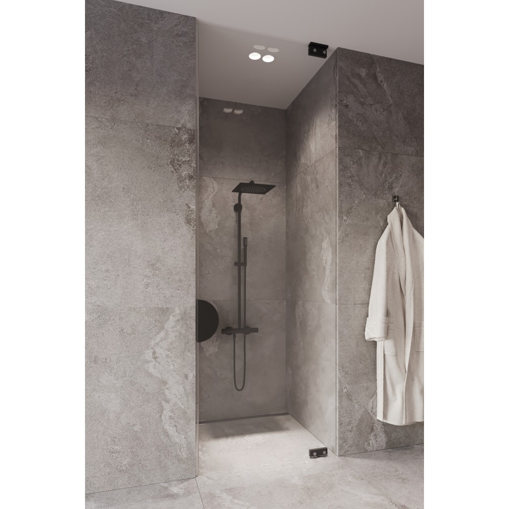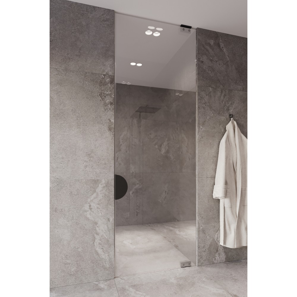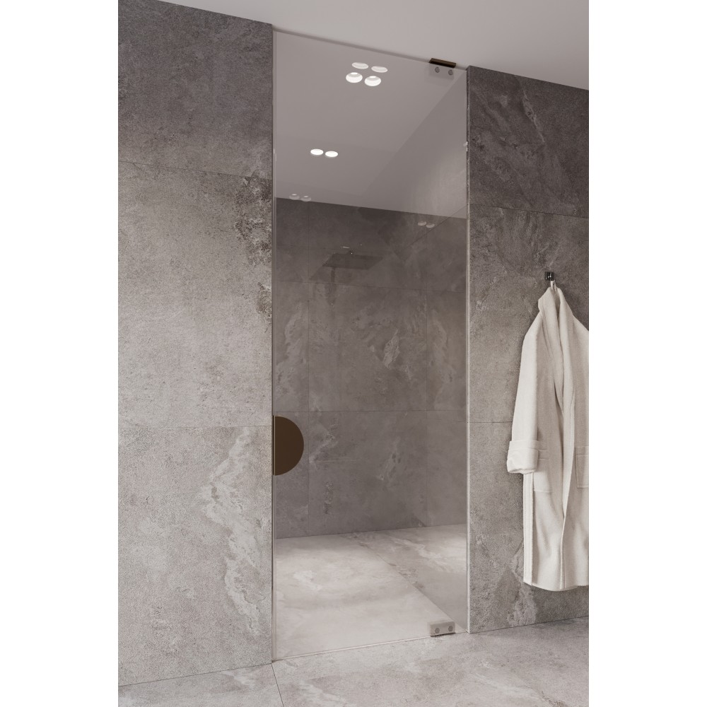 Minimalistische Duschtüren für Nischen aus der PREMIUM-Kollektion mit verdeckten Scharnieren und einem authentischen Griff.